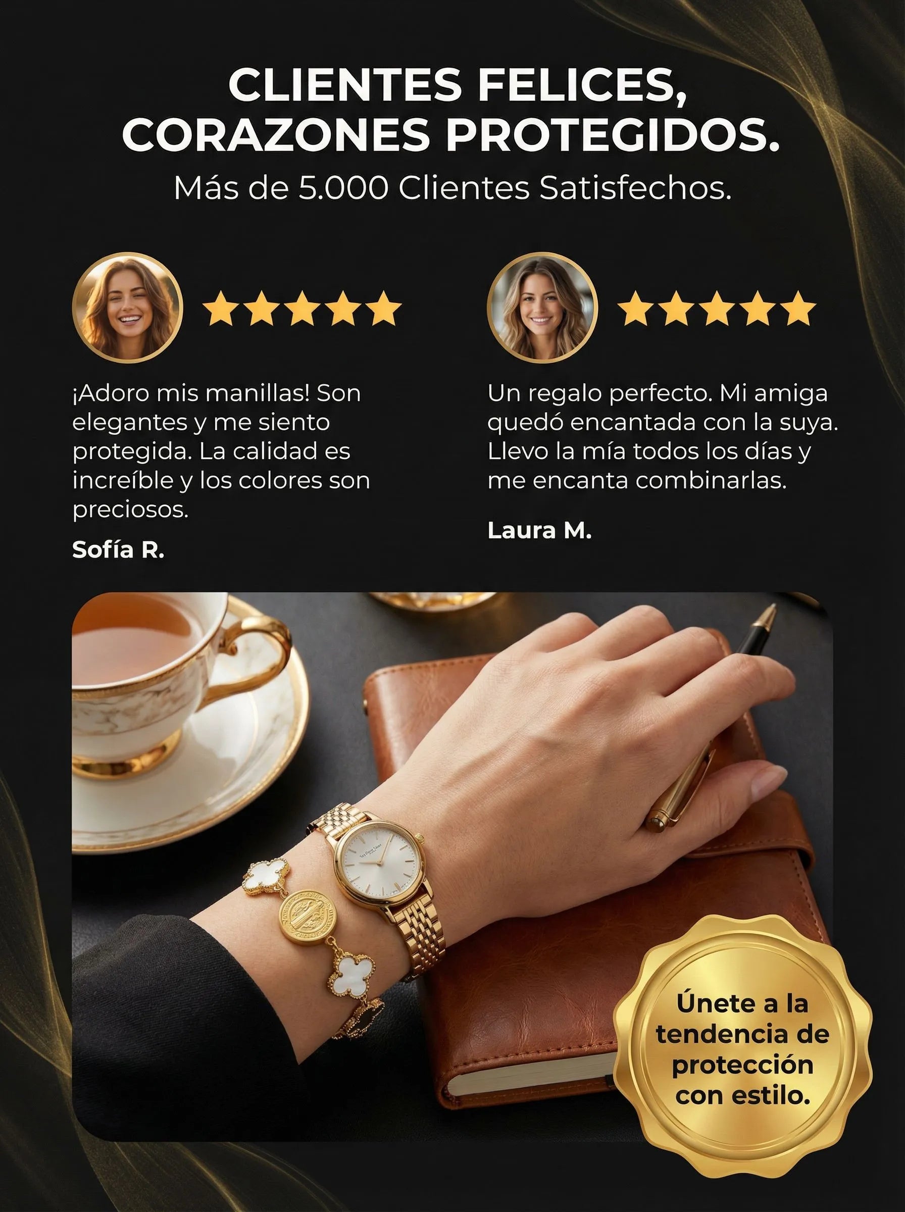 La pulsera es divina. Tiene un brillo muy fino y el diseño con los tréboles y la medalla me encantó. Perfecta para cargar la fe todos los días sin perder el estilo.